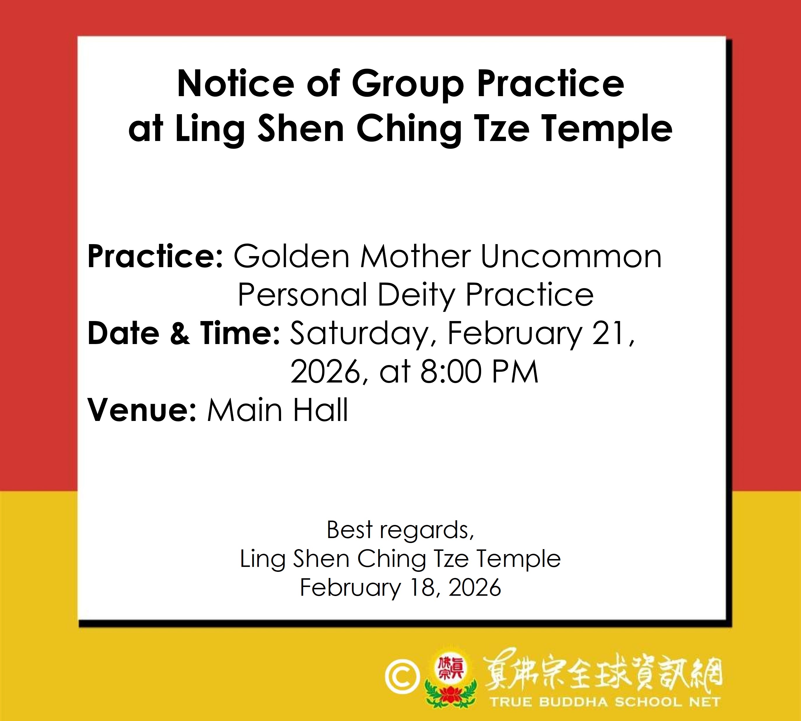 Notice of Group Practice at Ling Shen Ching Tze Temple