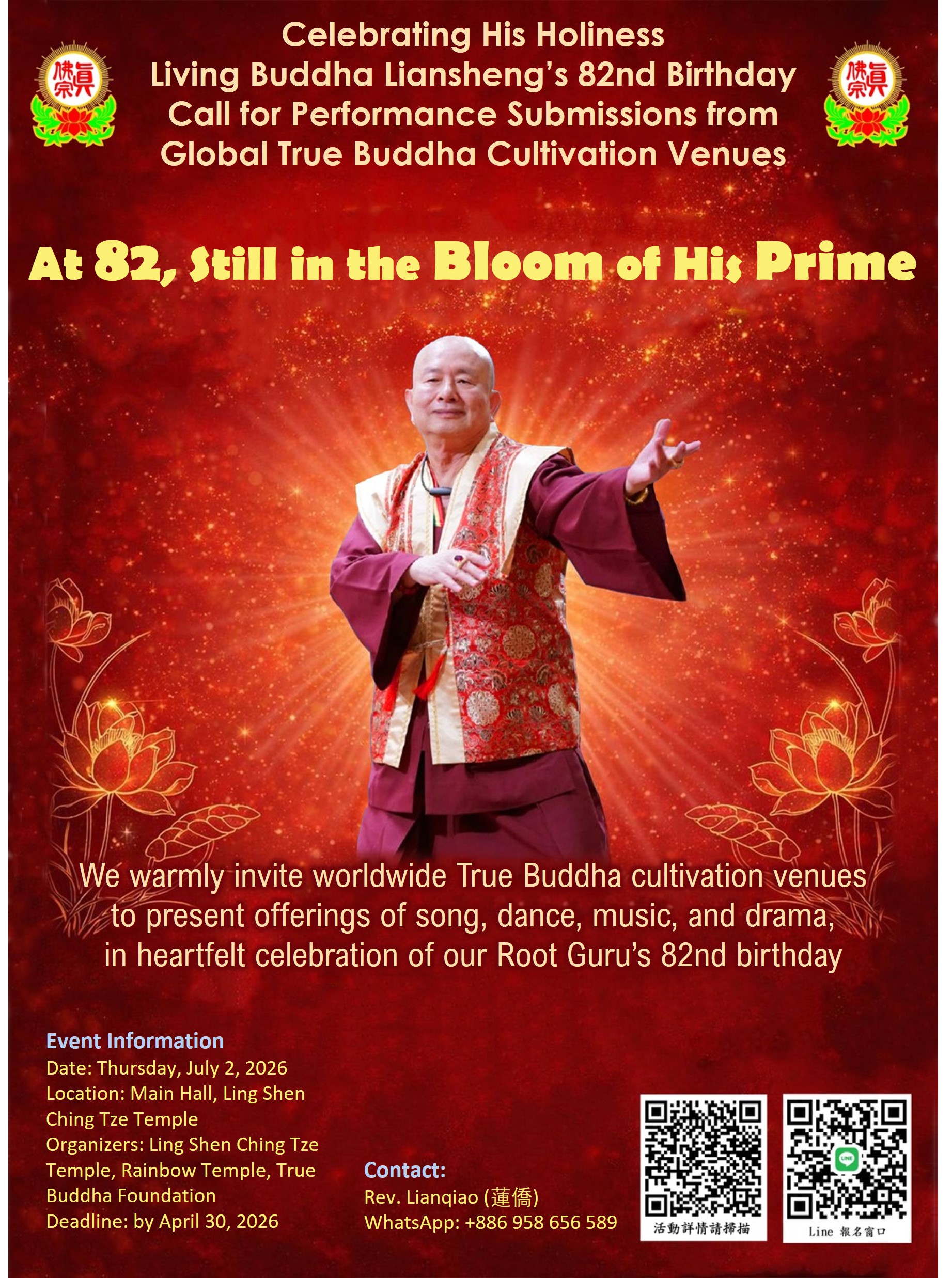 In this time of gratitude and joy, coinciding with His Holiness Dharma King Living Buddha Liansheng’s 82nd Birthday, we sincerely invite disciples from True Buddha cultivation venues around the world to offer their heartfelt devotion through song, dance, and other carefully prepared performances in honor of our Root Guru.