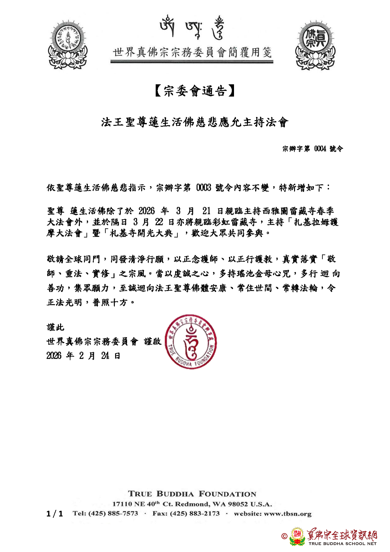 In accordance with the compassionate instruction of His Holiness Living Buddha Liansheng, the content of TBF Office No. 0003 remains unchanged, with the following addition: